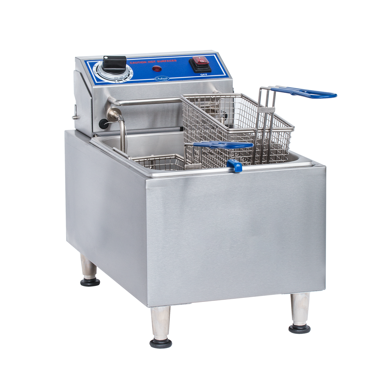 Chefmate by Globe's PF16E entry-level, light-duty fryer enables you to add a little something fried to your menu. This small but mighty fryer has a 16 lb. oil capacity! Easy to clean with removable control box and element, and includes nickel-plated fry baskets with insulated, cool-to-touch handles.