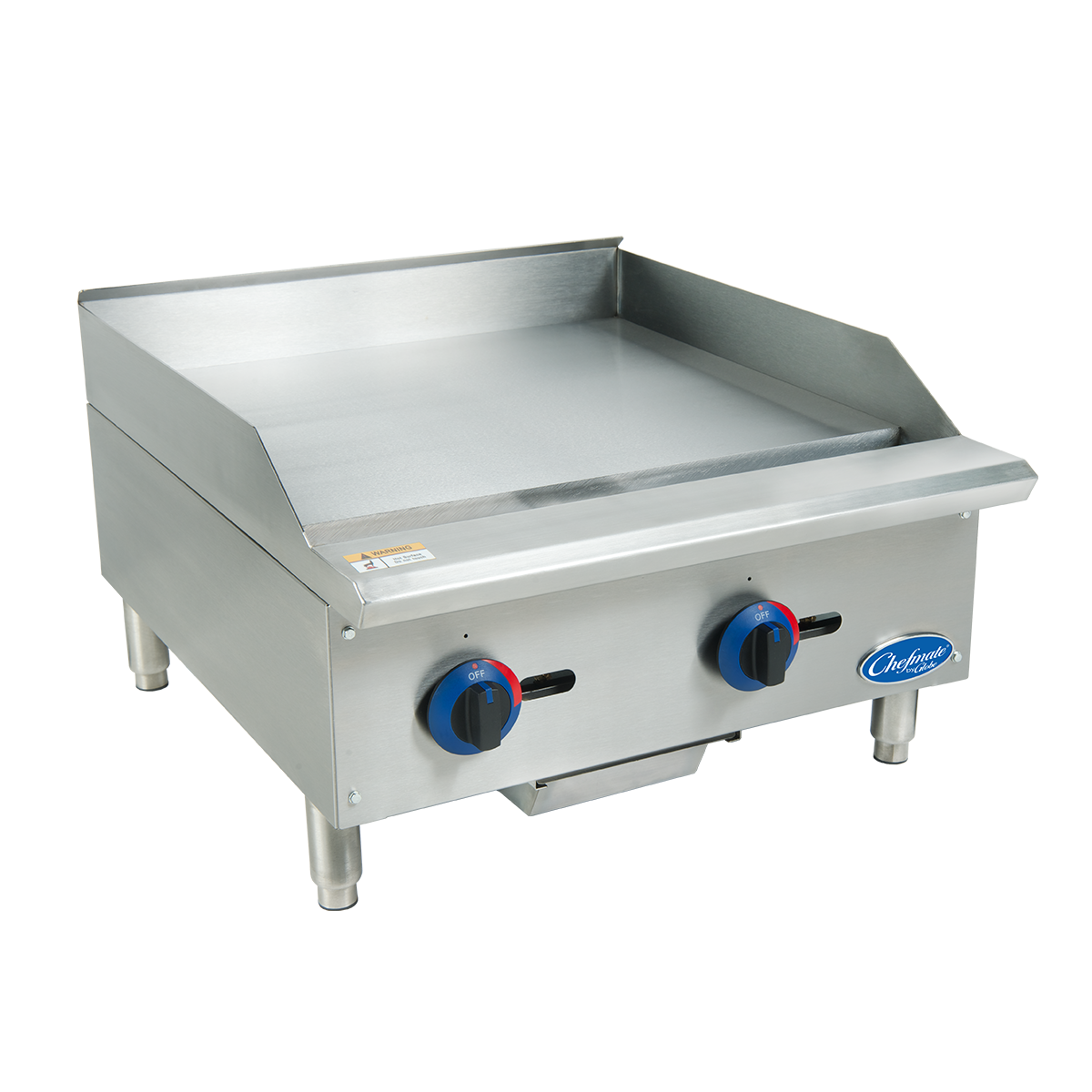 Whether you're cooking a lot of the same thing or a wide array of items at once, Globe's GG24G gas griddles are the best choice. thanks to the energy efficient insulation and evenly heated cooktops. The 1" thick stainless-steel griddle plate and 30,000 BTU U-style burners mean no dead zones or hot spots, so food is cooked evenly across the surface.