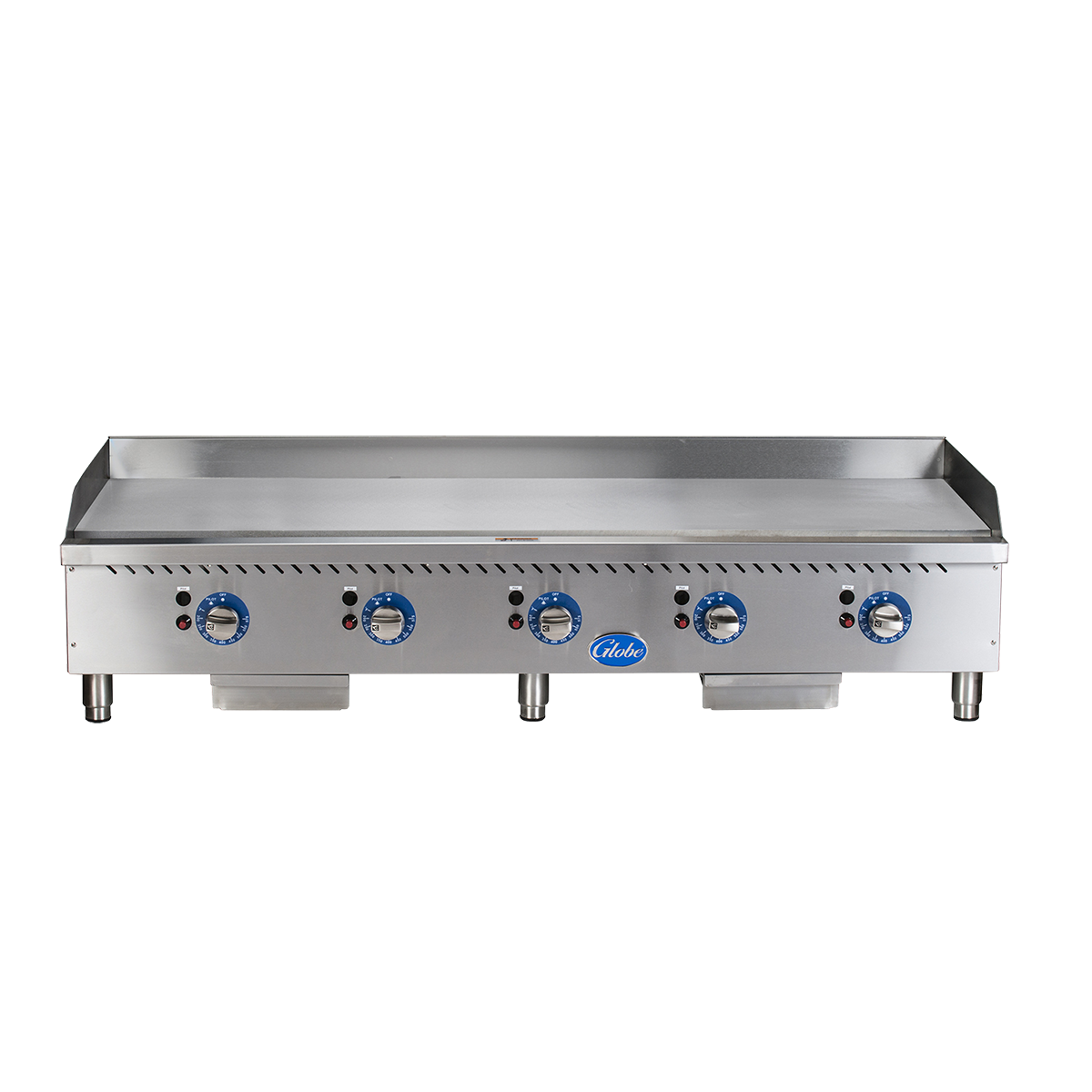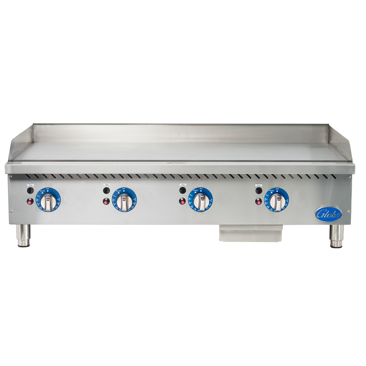 Whether you're cooking a lot of the same thing or a wide array of items at once, Globe's GG48G gas griddles are the best choice. thanks to the energy efficient insulation and evenly heated cooktops. The 1" thick stainless-steel griddle plate and 30,000 BTU U-style burners mean no dead zones or hot spots so food is cooked evenly across the surface.