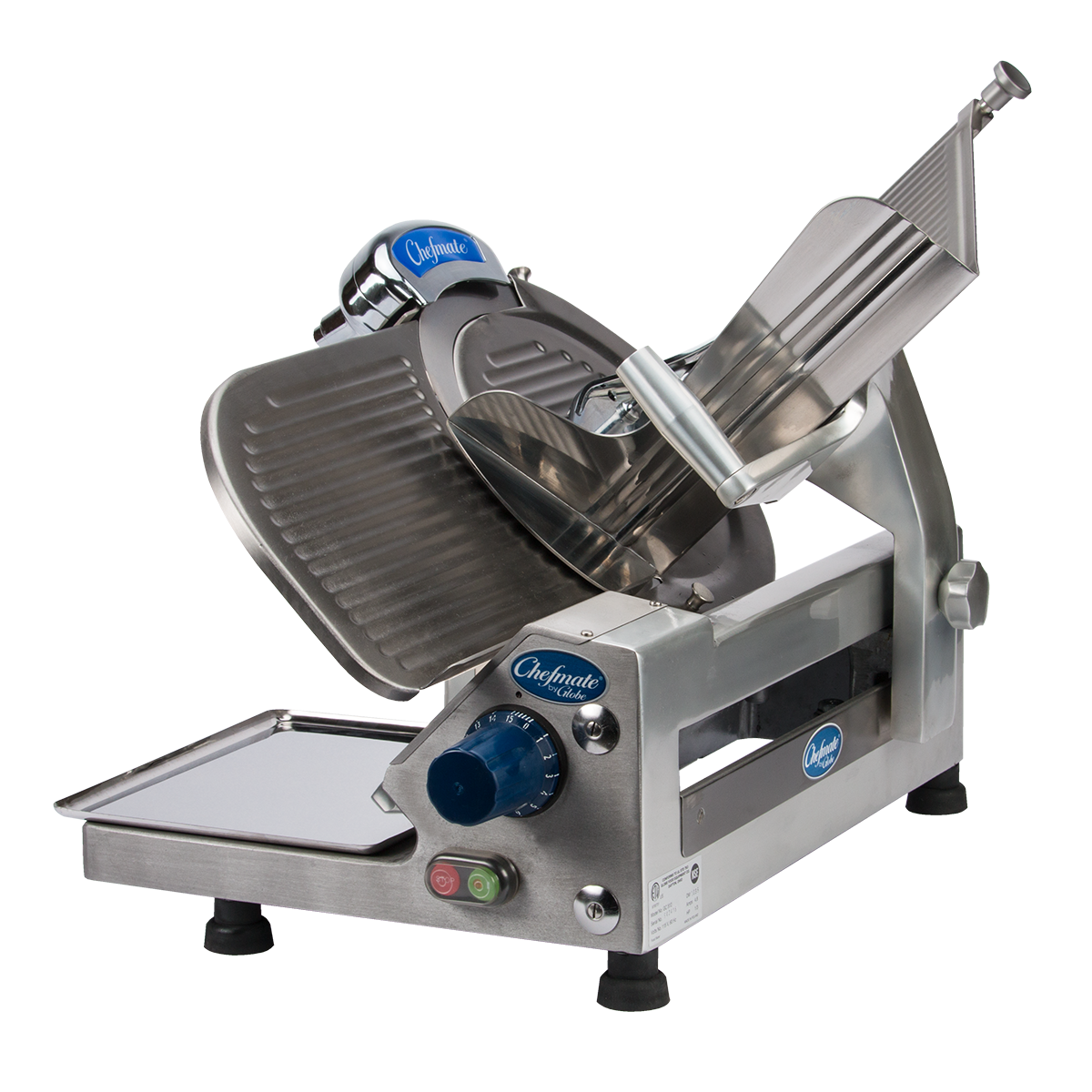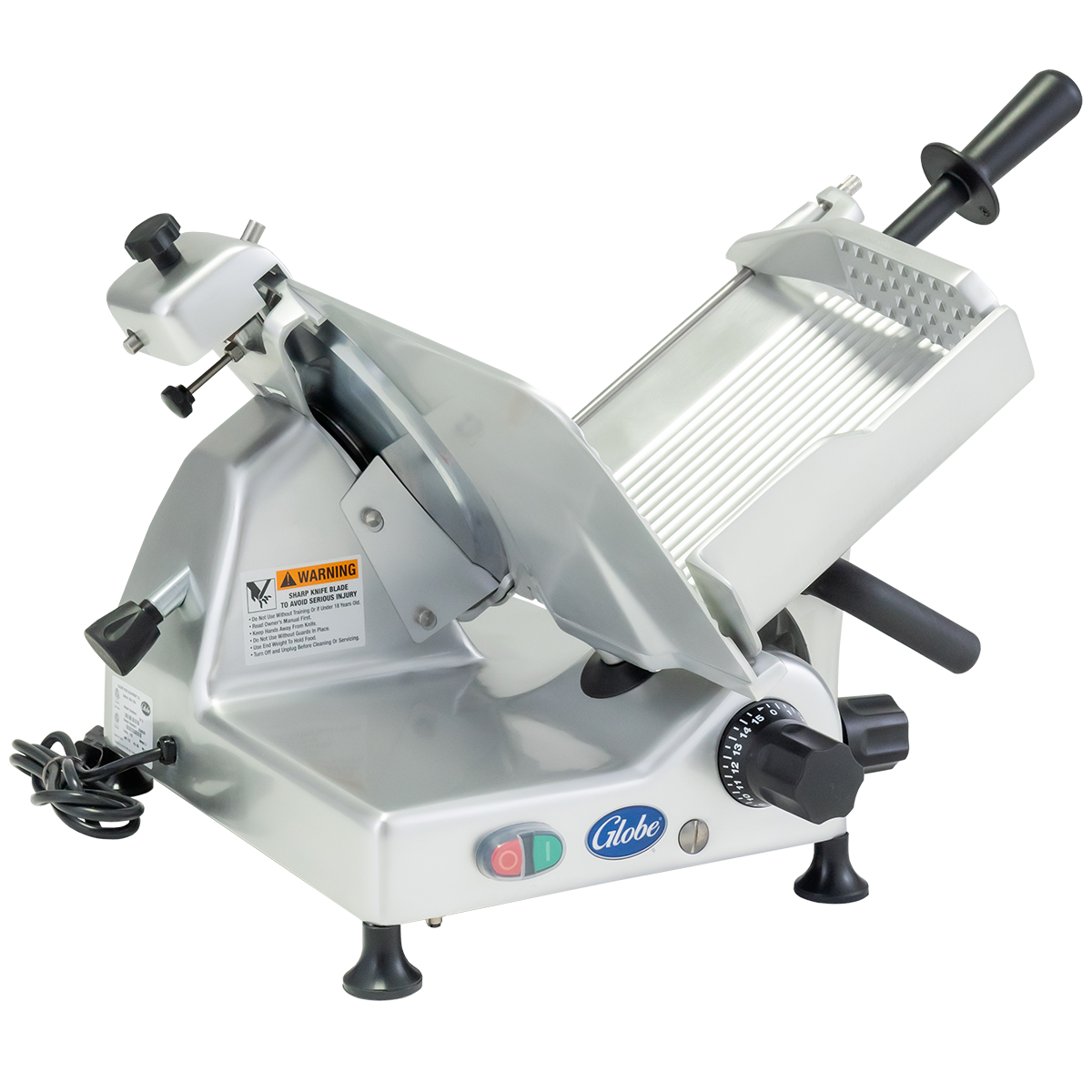Globe's G12A automatic slicer is perfect for mid-volume operations. The enhanced features of the G-series generate optimal slicing quality for meat and cheese. The extended rod, end weight and chute can accommodate product up to 10.5" in length and the pyramid-shaped end weight teeth improve product hold during slicing.